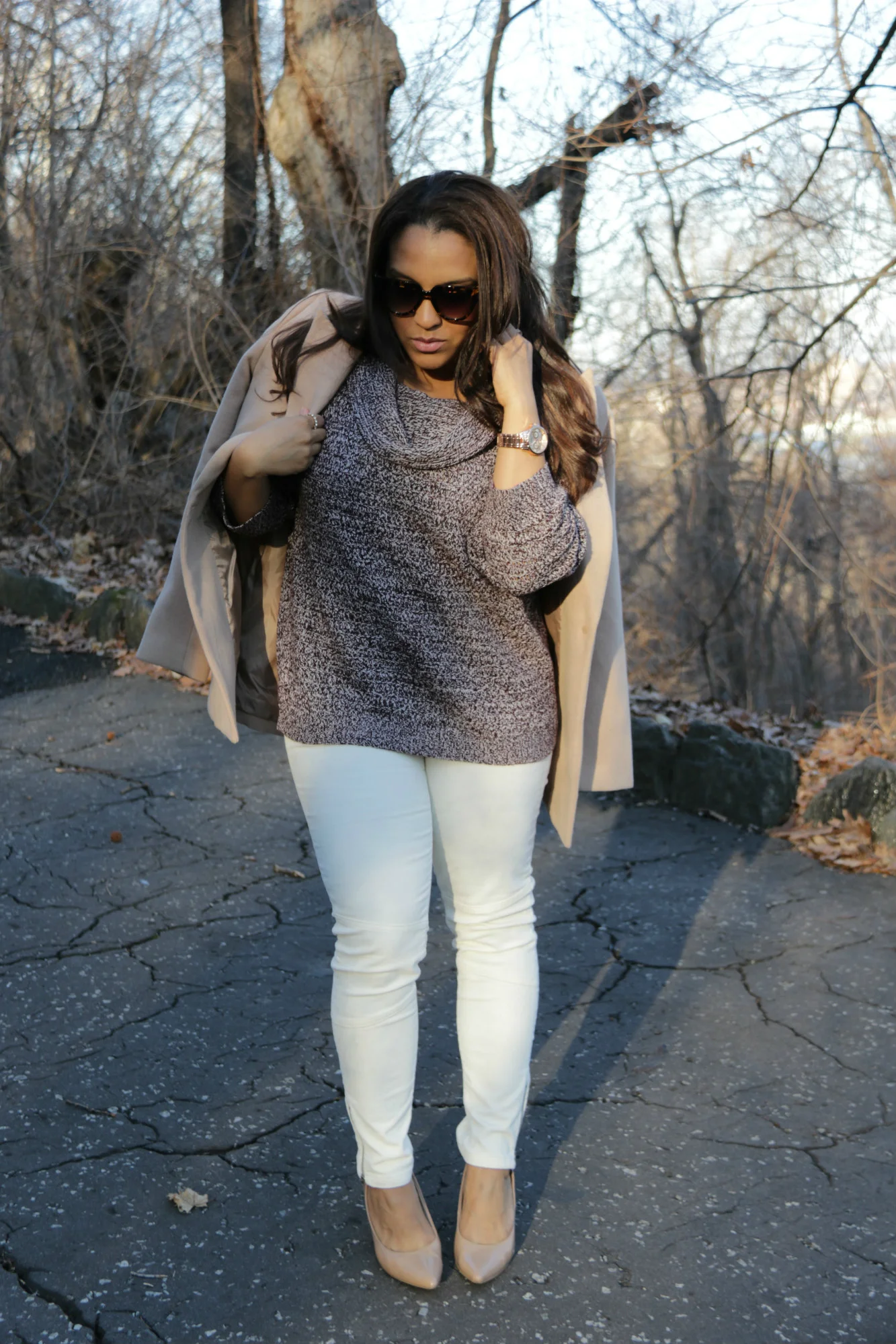 My newly gifted cowl neck sweater from NY&Co was a perfect match for it. Cozy and long enough to cover the front and back. Wearing white as a base or simply incorporating it into your look in the form of a blazer, white button down, bag or shoes are one of the many ways you can wear white in winter.